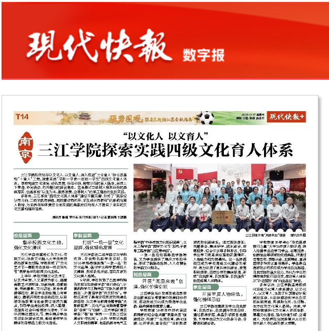 多年来,三江学院“四级文化育人体系”建设不断完善,形成了“顶层设计有方向、二级学院有特色、班级建设有抓手、学生成长有榜样”的系统性育人格局,为培养德智体美劳全面发展的高素质应用型人才提供了坚实的文化支撑和精神滋养。