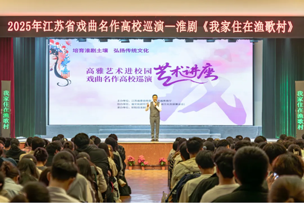 10月15日晚,江苏省高雅艺术进校园活动——射阳县淮剧团经典剧目《我家住在渔歌村》在三江学院温情上演。演出以轻喜剧形式讲述老渔民“笑开怀”坚守渔歌非遗、助力乡村振兴的故事,搭配婉转的淮剧唱腔与趣味互动,让传统戏曲的魅力浸润青春校园。
