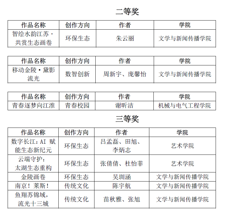 获奖作品紧扣“环保生态”“传统文化”“数智创新”“青春校园”四大主题方向,以AI技术为创作核心,呈现出多元融合的艺术表达。绘画与设计类作品通过AI场景生成、数字孪生等技术,生动勾勒江苏水乡生态、长江太湖保护的鲜活图景;影像类作品以时空穿越、吉祥物视角等创意巧思,串联起古城文脉与现代科技的碰撞交融;音乐作品则巧妙融合地域符号与校园场景,用鲜活旋律传递青春追梦的蓬勃力量。所有作品既展现了AI技术的创新应用,又蕴含着对社会发展、文化传承、生态保护的深刻思考,实现了技术赋能与思想内涵的有机统一。