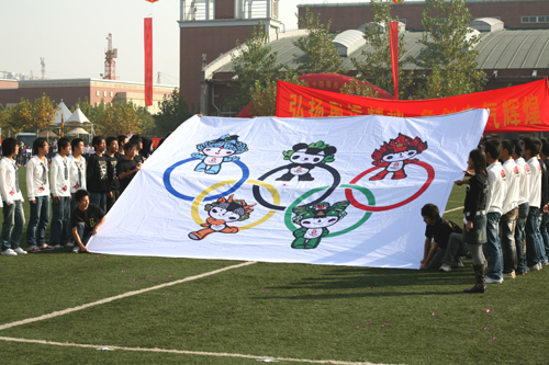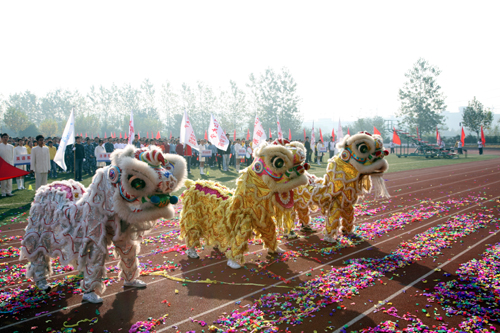 高程丽老师和吴飞同学分别代表裁判员和运动员宣誓之后是开幕式的重头戏——精彩的文娱表演。首先是传统的舞狮,表演完毕,叶俊副校长走下主席台为舞狮点睛。大体部编排的学生团体操动作整齐划一,场面宏大而富于变化;电子信息工程学院的街舞表演活力四射,翻滚、倒立、弹跳,一招一式极具专业水准;校工会老师们表演的团体操,舒展大方、韵律十足;英语系的舞蹈激越奔放,热情似火;日语系的舞蹈组合时而欢快洒脱,时而舒缓优雅;职成院的扇舞传统大气,成为开幕式表演的亮点与高潮。整场表演充满青春的朝气与活力,精彩的演出博得现场观众的阵阵喝彩。在表演的间隙,有些院系打出了精心准备的奥运福娃和标语,经济系的标语是“扬奥运精神,展经济雄风”,电气学院“弘扬奥运精神,争创电气辉煌”,充分展示了我校学子心系奥运的体育精神和爱国情怀。开幕式结束后举行了教工组比赛,老年组的定点投篮和青年组的“两人三足”融趣味性、娱乐性和竞技性于一体,从另一个层面诠释了体育的“贵在参与”的精神。
