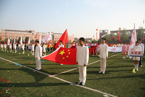 11月3日上午,我校第十四届运动会在校运动场隆重拉开序幕。运动场上乐声高扬,彩旗飘舞,拱门、彩球、鲜花、笑脸把开幕式装点得华丽多彩,现场洋溢在节日般的喜庆气氛中。8时许,入场式开始,着装整齐统一的国旗方队、校旗方队、红旗方队、鲜花方队和各院系运动员方队依次入场。各方队踏着整齐的步伐,精神豪迈地通过主席台。嘹亮的口号展示了我校师生昂扬的斗志和意气风发的精神面貌。接着举行升国旗仪式,鲜艳的五星红旗伴随着庄严的国歌冉冉升起,在蓝天和艳阳的映衬下显得更加耀眼夺目。