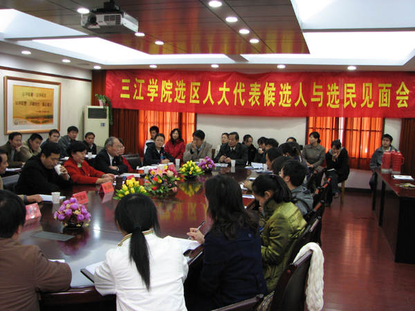 2007年11月19日,已是初冬,天气晴寒,下午15:30三江学院行政楼101会议室内却与清寒的天气相反,洋溢着热烈的气氛。人大换届选举三江学院选区的部分选民代表齐集一堂,在三江学院选区选举工作领导小组组长叶俊副校长的主持下举行了“人大换届选举工作会议暨代表候选人见面会”。三江学院选区选举工作领导小组周更生副组长、张军副组长及全体成员、选区选民六十多位代表和选区人大代表候选人出席见面会,铁心桥街道办事处李古财副主任和铁心桥街道人大工委艾宝祥副主任与会见证。