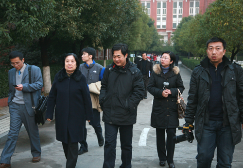 座谈后,客人们在陈万年校长的陪同下来到牌楼前合影留念。随后,来访客人参观了第一教学楼、体育馆、学生食堂等教学生活基础设施。