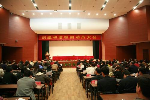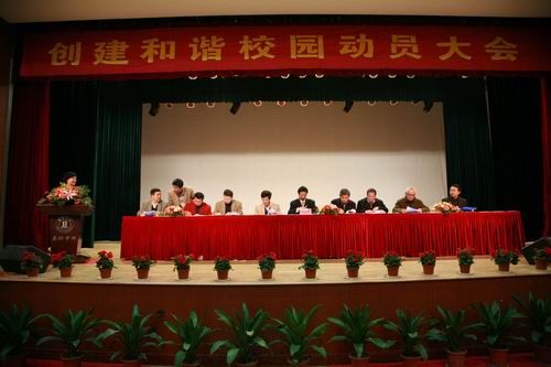 4月16日下午2点,创建和谐校园动员大会在三江会堂隆重举行,全体教职工出席大会,校领导和各院系、部处和教学单位负责人在前排就座,大会由党委副书记、副校长叶俊主持。党委书记、校长陈万年作动员报告,陈书记在报告中说:“今天我们在这里召开三江学院创建和谐校园动员大会,主要是贯彻落实省教育厅下发的《江苏省教育厅关于在全省高等学校深入开展和谐校园创建活动的通知》精神,对扎实推进我校安全稳定工作的开展,促进和谐校园建设,争创江苏省高等学校和谐校园进行工作动员和部署。下面,我就和谐校园创建活动讲四点意见。”他指出:我们要站在构建社会主义和谐社会的高度理解和领会创建和谐校园的重要意义 。陈书记提出了和谐校园创建活动的目标、指导思想和总体要求。在谈到党风廉政建设时,他特别警示,不是非党员就与此无关,都要立足本职加强廉政建设。他突出强调了安全稳定工作,指出这是建设和谐校园的前提和基础。他深情地说:“学校的安全稳定直接关系亿万家庭的幸福,历来是家长操心、学校担心、社会关心的大事。”他要求对创建和谐校园活动要加强领导、强化责任、齐抓共管、人人参与、共创和谐。他指出:学校将从2008年起评选“安全文明单位”,在此基础上评选表彰“创建和谐校园先进单位”,并把评选“创建和谐校园先进单位”作为对照评选校先进集体的前提条件。他要求校报和其他校园媒体要加强宣传教育,提高思想认识,营造良好氛围,推动和谐校园创建活动深入持久开展,逐步形成宽容和谐、积极向上的校园文化氛围。