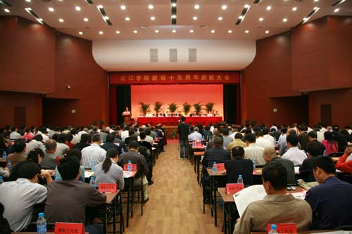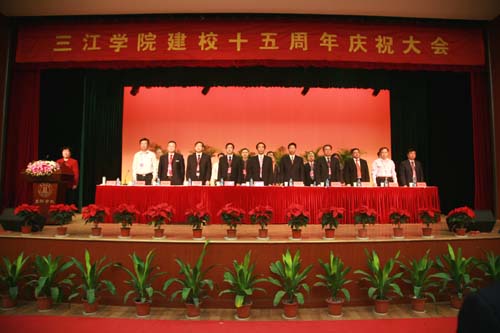 十五年风雨春秋,十五年薪火传承。2008年10月18日,江苏省第一所民办本科高校——三江学院迎来了她十五周岁的生日!沐浴在秋日暖阳中的三江学院一派欣欣向荣的气象:风清气爽,鸟语花香,绿树摇曳,彩旗迎风飘扬;“热烈庆祝三江学院建校15周年”、“融百余年老校风范 承十五载拼搏精神 展民办教育之华彩 铸三江未来之辉煌”等横幅随风舒展;笑意可掬的校友,欢乐喜庆的迎宾曲,往昔今日的宣传栏……校园里处处洋溢着祥和、喜庆、和谐和朝气蓬勃的气息!